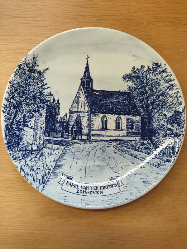 Poreceleinen schotel met afbeelding / pentekening van de Kapel van Ten Eikenen in Zonhoven.  Delfsblauw